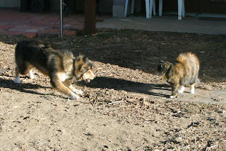 This morning I got a couple of shots of the two of them together. Cute pair, eh? As these photos were taken, KK chased after Zadie a bit…Zadie made a run for it. Cats rule, I guess.