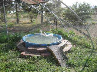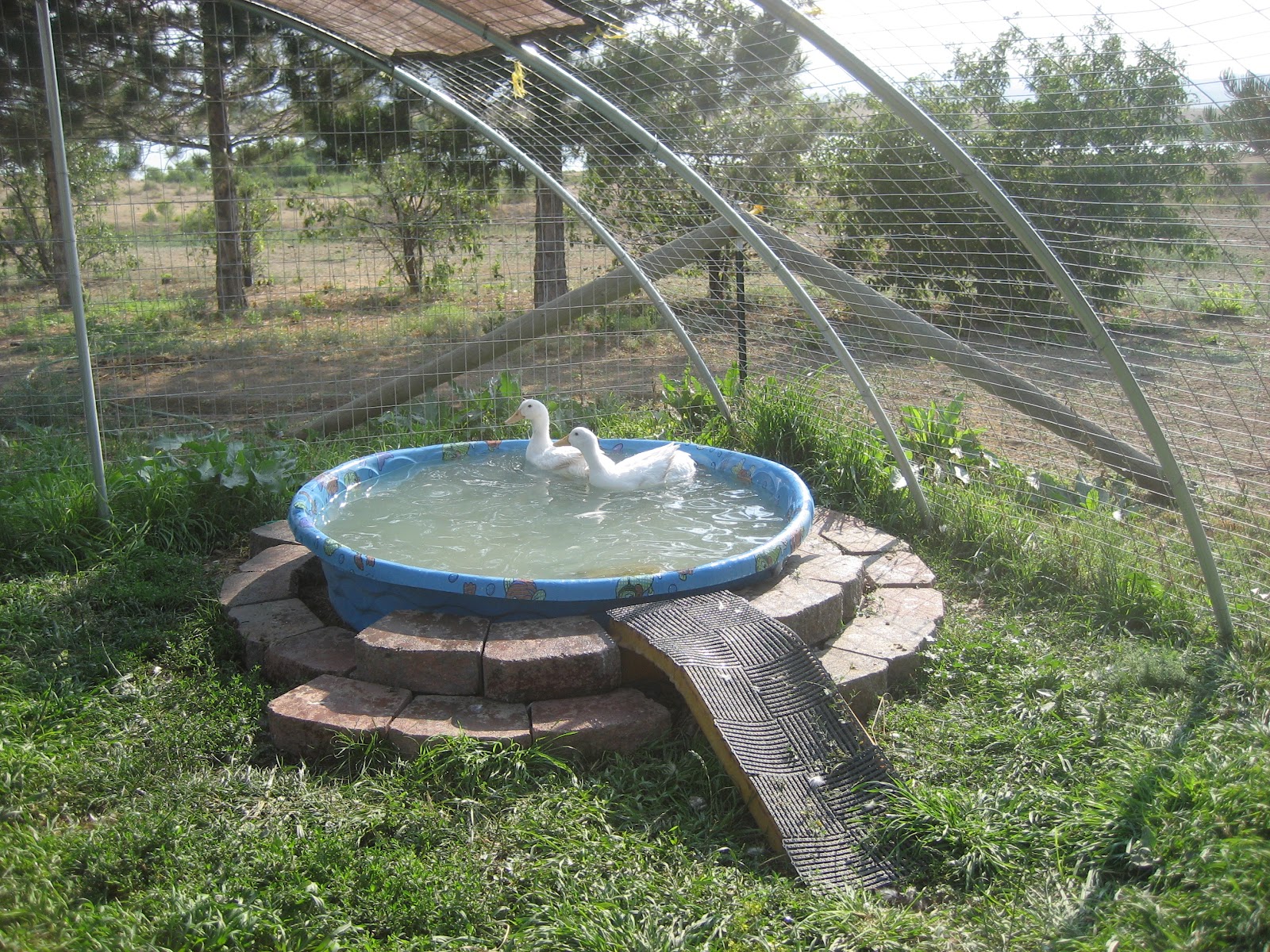 When we let them out with the others, the first thing they did was find the pool. One of them got in pretty quickly, but it took a while for the other to figure out how to get in. We’ve tagged the new ducks with red and yellow leg bands, to fit in with our color scheme.