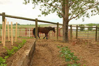 This morning I doused all the plants with “manure tea”, with thanks to my helper on the other side of the fence. I pruned the suckers off the tomatoes and planted some more marigold seeds.
