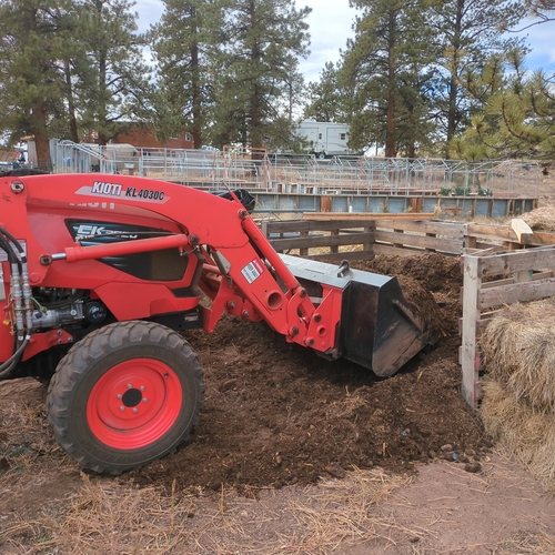 Temperature: We add our compost thermometer after the layering and close the lid. We watch the temperature each day with a compost thermometer. It will usually climb to 120-130°F and stay there for a couple of days. Then the temperature will begin to drop. When it’s around 100°F we’ll usually mix it up with a small tiller we have. This breaks up chunks and manure “apples” and makes the compost nice to work with. (I know that many people frown on tilling, but this really mixes it up well and gives the compost a better texture. Our compost seems to be quite healthy despite the tilling.)