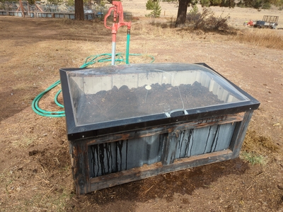 Composter: Tim made this just the right size to fit a 4′ skylight we’d gotten at a thrift store to use as a lid. The front panel is easily removed, and our old tractor had a 4′ bucket that fit right into the composter to pull out the compost. Very handy. Our new tractor bucket is too large, but the convenience was nice for the first few years. Now we shovel the compost into the tractor bucket or a wheel barrow.