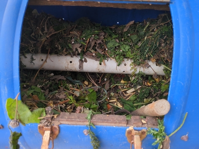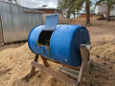 Tumbler: As we gradually collect compost materials such as garden clippings and kitchen scraps we dump them into this horizontal tumbler. Tim originally made this to make the compost, but it didn’t work so well. Now it is used as a “pre” compost collector. It’s nice that it spins to mix everything up. This tumbler drum has holes drilled into the sides for ventilation, as well as holes drilled into the PVC axle. We do not add water to this, it’s usually plenty moist. If it should become too moist or begin to get slimy-yucky, we’ll add some wood shavings, dried leaves or old hay, basically some sort of “brown” material.