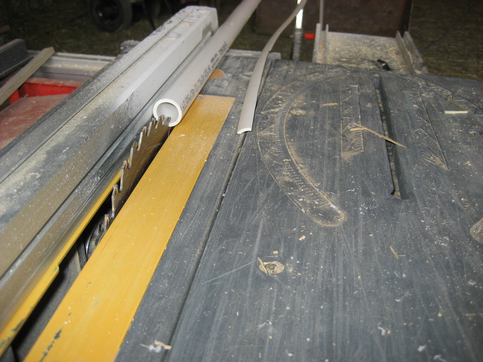 Tim took the piping on his table saw and ripped it into 4 pieces, as shown.