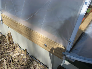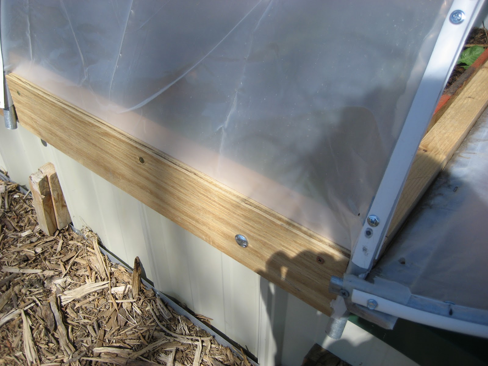 Before the wind storm, we had attached the cold frame with short pieces of pvc pipe placed over the ends of the hoops onto a grooved piece of wood attached to the bed frame, as shown at the right.